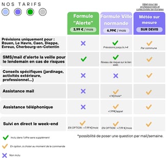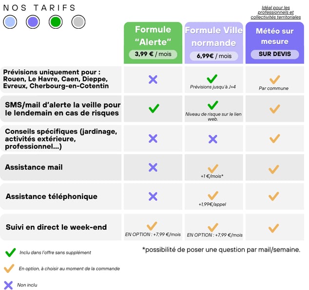 La formule "Ville normande" vous permet d'accéder à une prévision détaillée par tranche horaire de 03h à J+1 (le mardi pour le mercredi par exemple), puis par tranche "nuit/matin/après-midi/soir" de J+2 à J+4. Les villes suivantes sont concernées : Rouen, Le Havre, Caen, Evreux, Dieppe, Cherbourg-en-Cotentin. Vous recevrez un lien web ou un mail avec .pdf avec votre prévision de manière journalière.